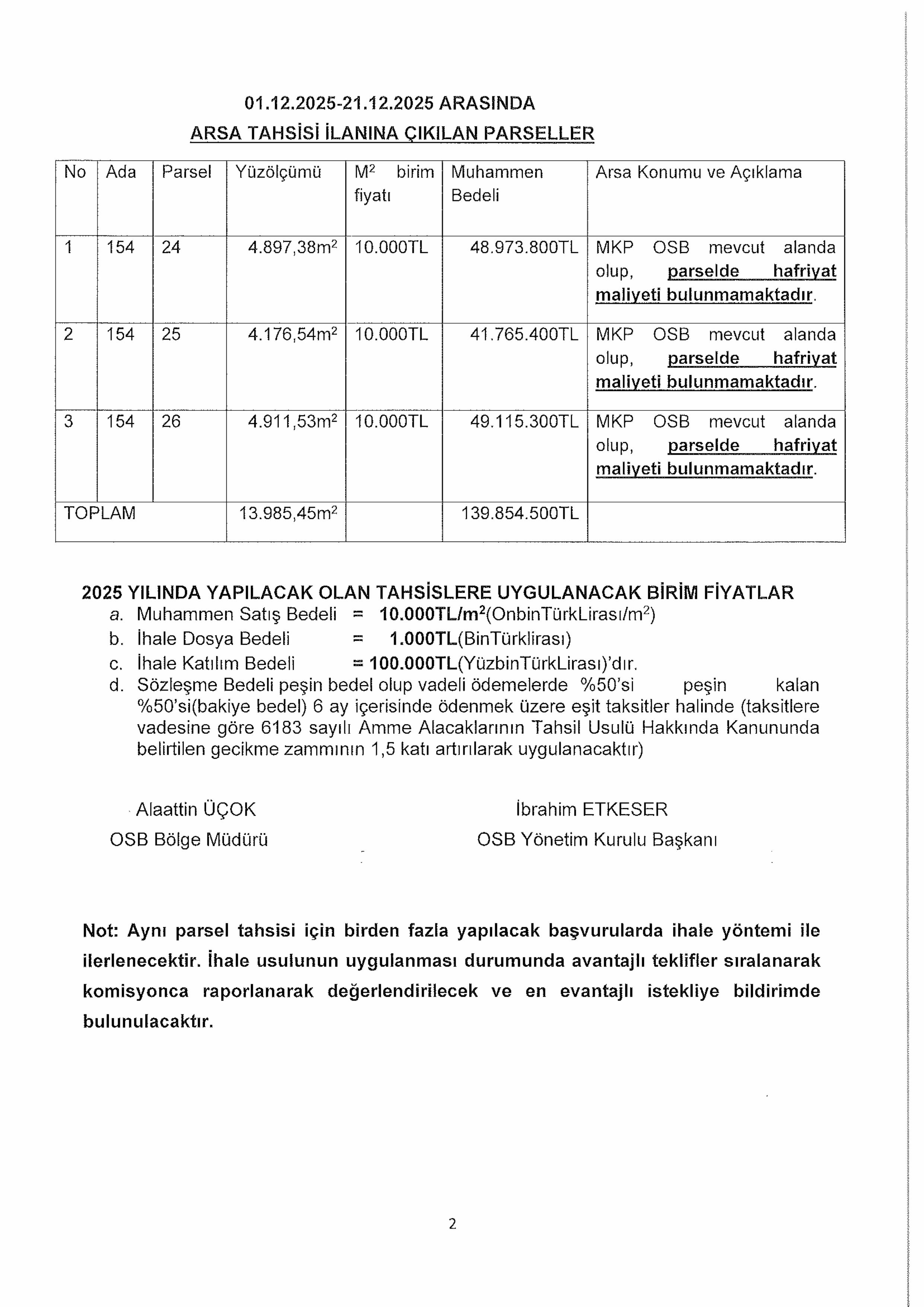 OSB ARSA TAHSİS İHALE İLANIDIR.
